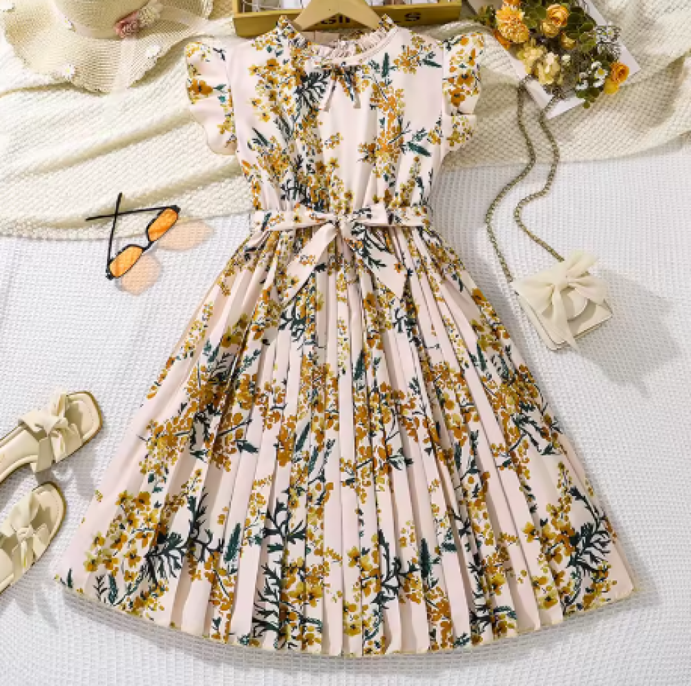 دلّلي صغيرتك بإطلالة أنثوية مفعمة بالبهجة مع فستان بناتي أصفر مطبوع بتصميم ناعم يعكس أجواء الصيف المشرقة.